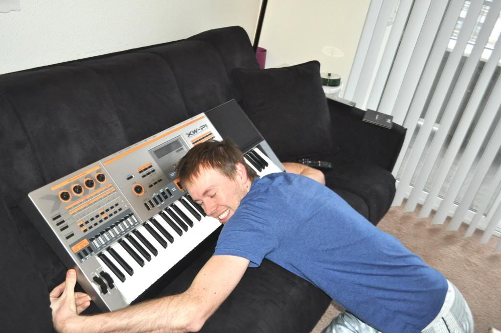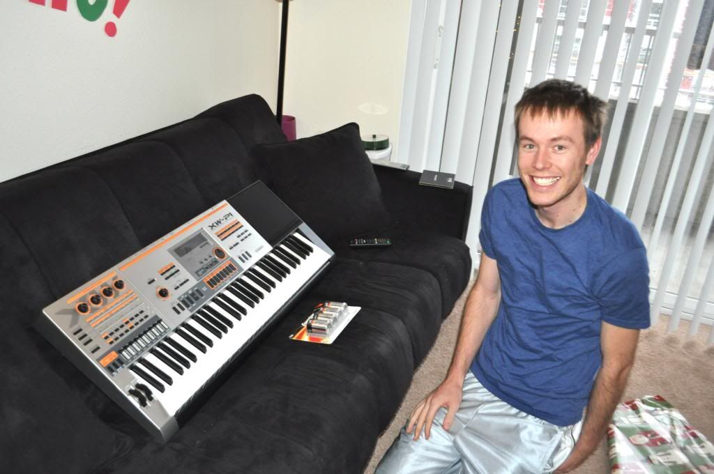 The first present he unwrapped that morning was a baby key board for our baby. I told him that was as close as he was getting and he laughed. His next present was a jumbo pack of D batteries. He stared at them for a long time and then I told him, "Oh yeah, those are for your last present. It's out in the living room." At this point I think he caught on and he ran out finding his keyboard on the couch. He was still half asleep but so excited! It was a complete surprise to him and he was ecstatic. It was so exciting to surprise him. He deserves it. He has worked so hard there past few months and takes such good care of this crazy baby lady. Plus we will be dirt poor here in a few months, so he better enjoy his last expensive present for the next 18 years!
